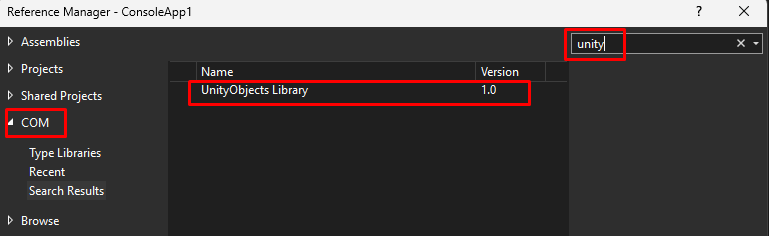 Açılan pencerede “COM” sekmesi altından “UnityObjects Library” bileşenini seçin ve ekleyin.