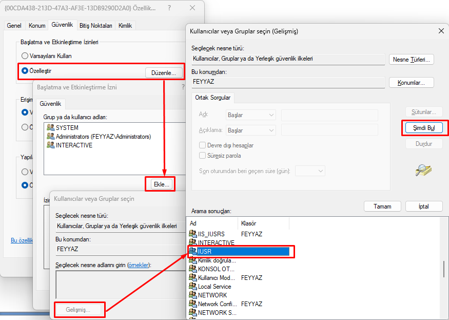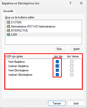 Eğer DCOM üzerinden yetki vermek sorun çözmüyorsa, IIS tarafında Application Pool kullanıcısını değiştirerek yetki atayabilirsiniz.