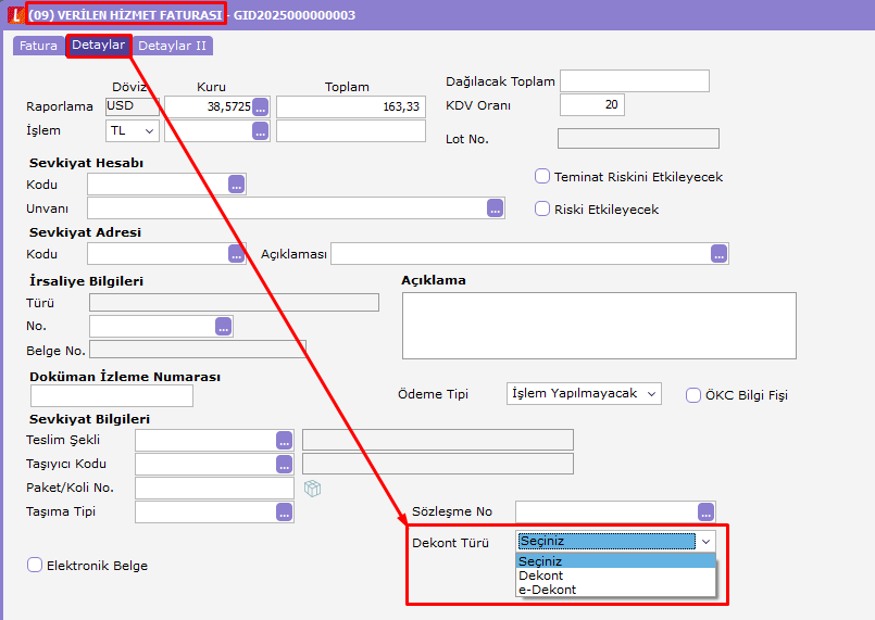 3. Fatura Detaylarında Dekont Türünü Seçin: Yeni bir satış faturası oluşturun. Fatura giriş ekranının Detaylar sekmesine geçin. Sağ alt köşedeki “Dekont Türü” veya “Fatura Türü” seçenekleri arasından Dekont/E-Dekont tipini işaretleyin. (Logo’da faturayı dekont türünde oluşturmak için bu seçimi yapmalısınız.)