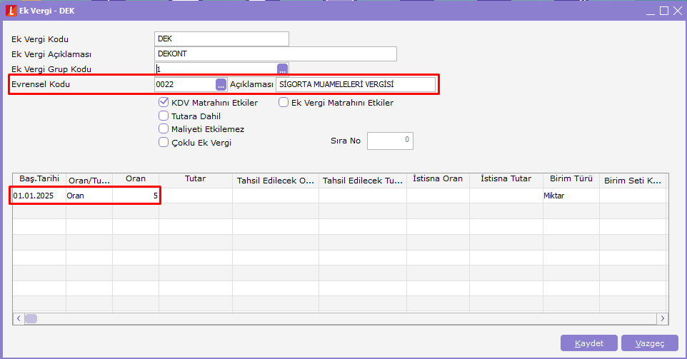 1. Ek Vergi Tanımı Oluşturun: Logo’da Malzeme Yönetimi –> Ana Kayıtlar –> Ek Vergiler bölümüne girerek BSMV (BSMV özel kodu) için yeni bir ek vergi kaydı oluşturun. Bu kayıtta Evrensel Kod, başlangıç tarihi ve oran bilgilerini doğru girin. Belge elektronik olacağından başlıkta doğru evrensel kod (vergi kodu) olmalı; satırda ise BSMV oranı ve yürürlük tarihi eksiksiz tanımlanmalıdır.