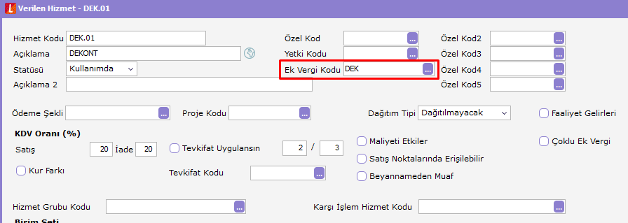 2. Hizmet Kartına Ek Vergi Uygulayın: Ek vergi kaydını oluşturduktan sonra, ilgili mal/hizmet kartını açın. Bu kartın Ek Vergiler alanından az önce tanımladığınız BSMV ek vergisini seçip kaydedin. Böylece söz konusu hizmet faturaya eklendiğinde ilgili ek vergi otomatik uygulanacaktır.